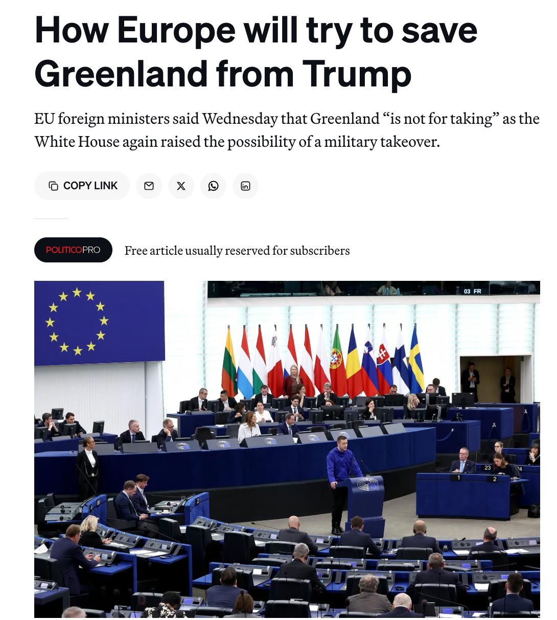 Politico описує чотири варіанти дій, які Європа може зробити, щоб перешкодити анексії Гренландії.