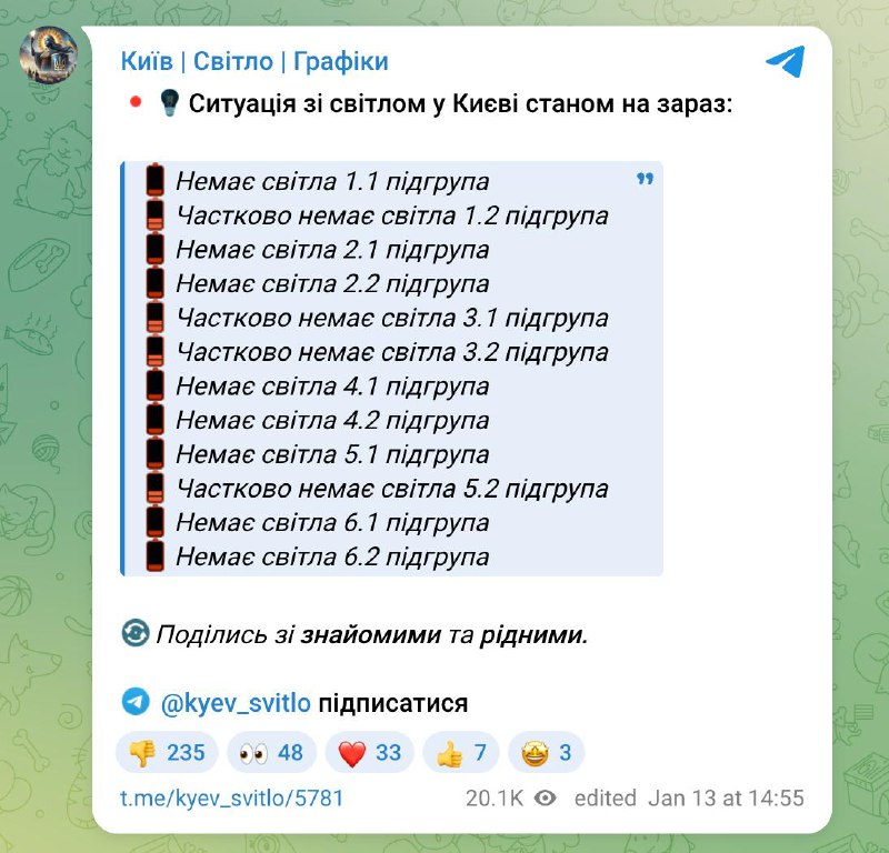 Про це свідчать дані столичних телеграм-каналів, які відстежують ситуацію зі світлом.