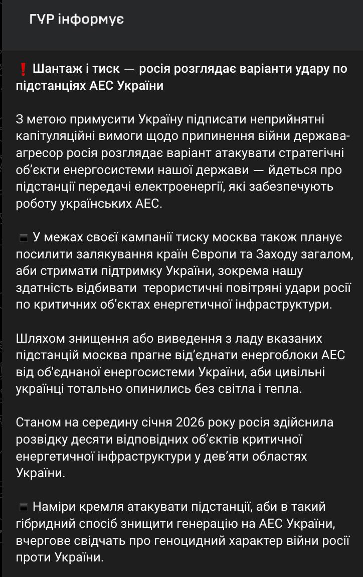 "Шляхом знищення або виведення з ладу зазначених підстанцій Москва прагне від'єднати енергоблоки АЕС від об'єднаної енергосистеми України, щоб українці повністю залишилися без світла і тепла. Станом на середину січня 2026 року Росія провела розвідку десяти відповідних об'єктів критичної енергетичної інфраструктури у дев'яти областях України”, – повідомляє ГУР.
