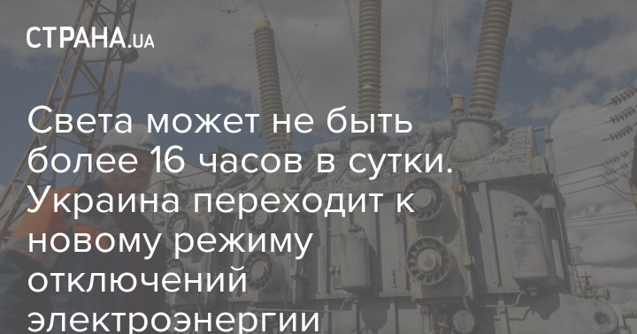 Україна переходить до режиму відключень світла, при якому електропостачання у побутових споживачів може не бути бiльш нiж 16 годин на добу. Новий графік передбачатиме 4,5-5 черг планових відключень.
