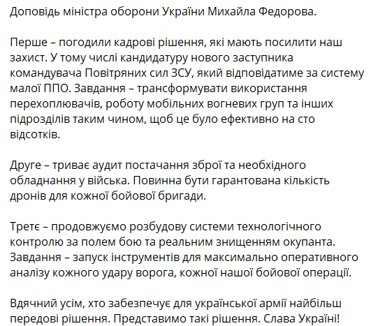 Про це Зеленський написав у своєму телеграм-каналі за підсумками доповіді нового міністра оборони Михайла Федорова.