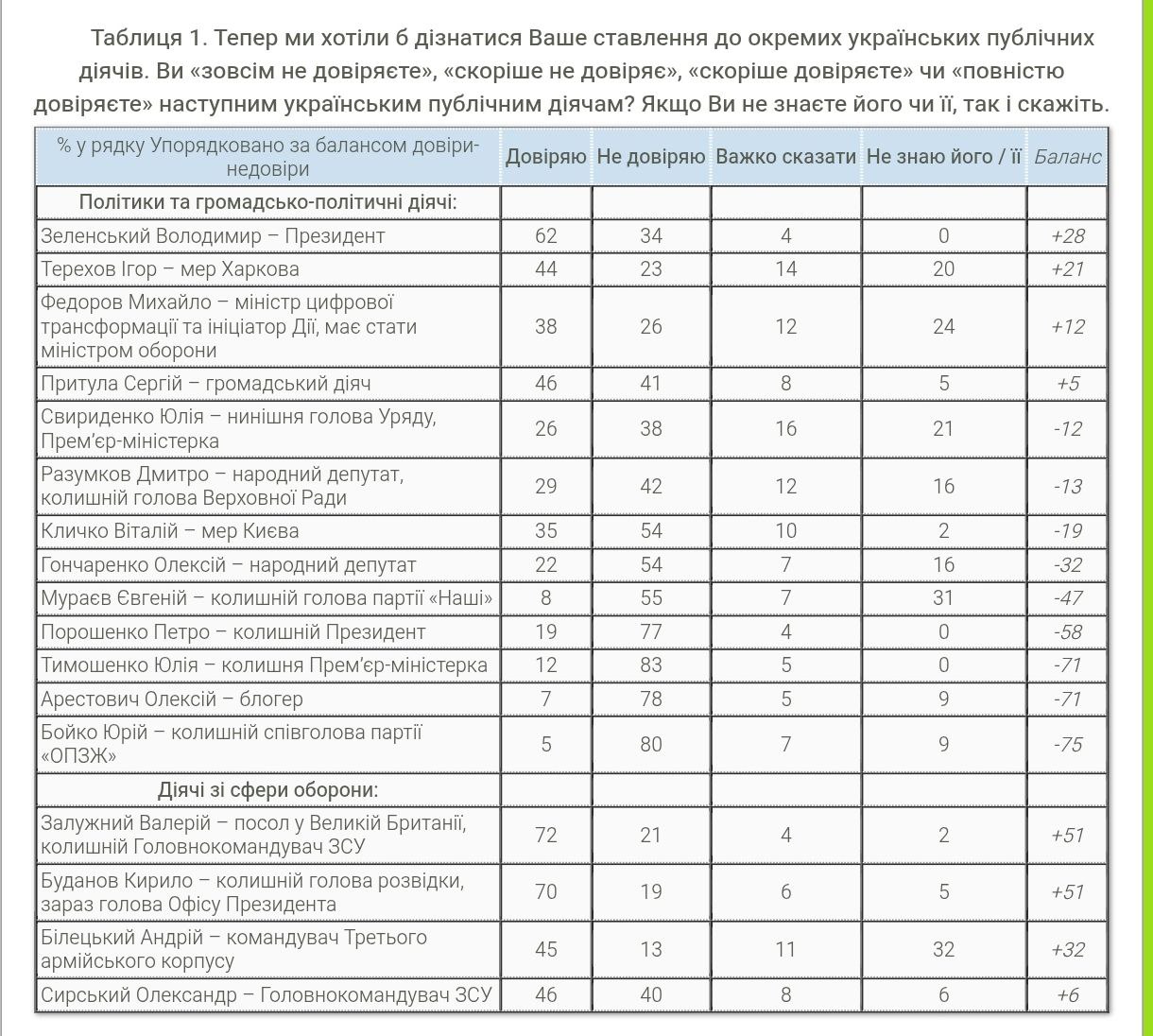 Згідно з цими даними, Зеленському довіряють 62% українців, тоді як екс-главкому та послу у Британії – 72%, а колишньому голові військової розвідки та нинішньому керівнику Офісу президента – 70%.