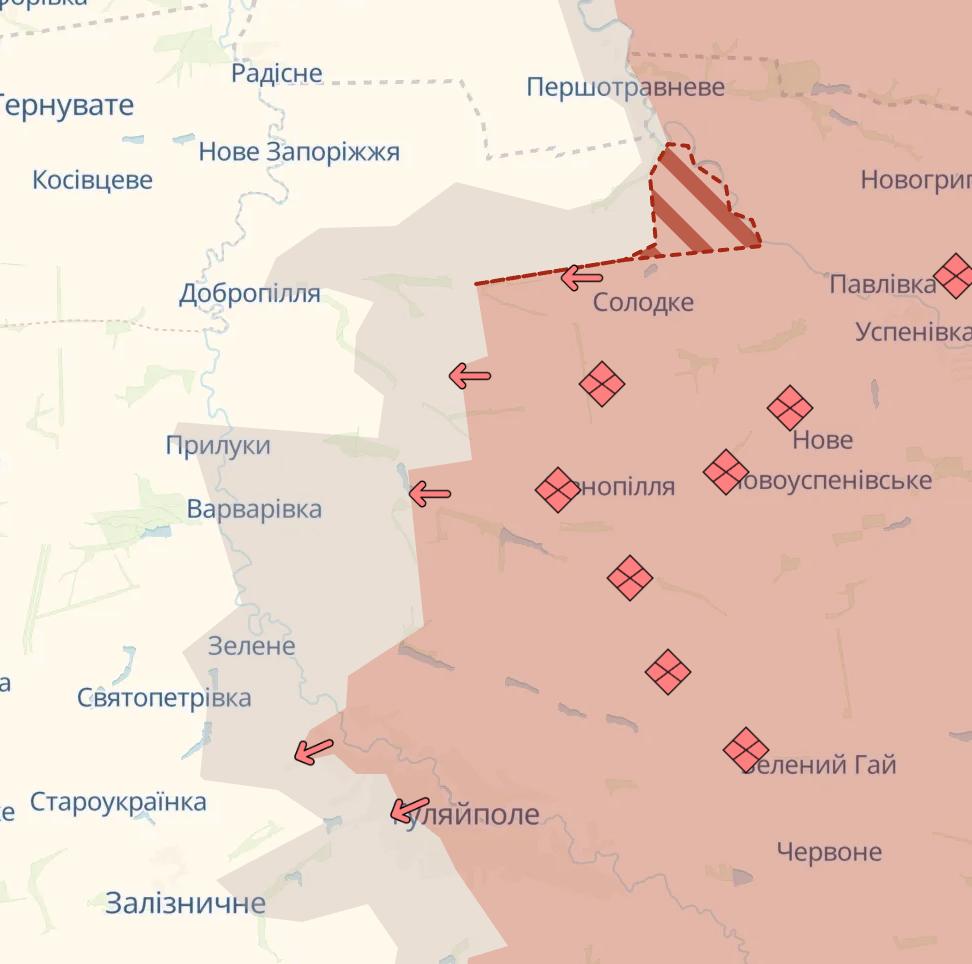 10.44 Армія РФ знову просунулась у Покровську і на північ від Мирнограда, а на північ від Гуляйполя захоплено село Рибне, повідомляє Deep State.