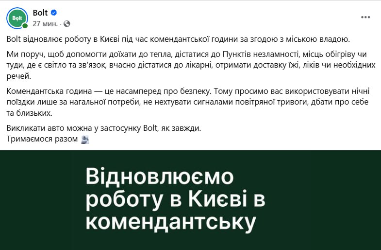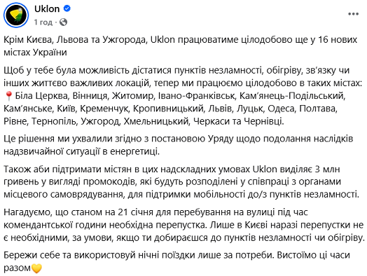 "Щоб у тебе була можливість дістатися пунктів незламності, обігріву, зв'язку або інших життєво важливих локацій, тепер ми працюємо цілодобово у таких містах: Біла Церква, Вінниця, Житомир, Івано-Франківськ, Кам'янець-Подільський, Кам'янське, Київ, Кременчук, Кропивницький, Львів, Луцьк, Одеса, Чернівці", - заявили у компанії.