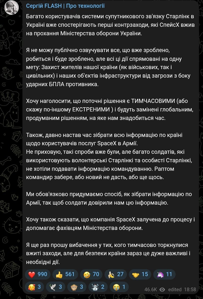 "Багато користувачів системи супутникового зв'язку Starlink в Україні вже спостерігають перші контрзаходи, які SpaceX зробила на запит Міністерства оборони України", - заявив Бескрестнов.