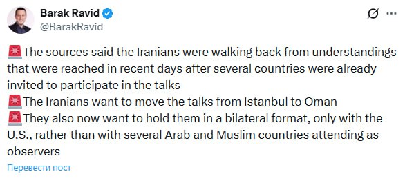 "Джерела повідомили, що іранці відмовляються від досягнутих в останні дні домовленостей, після того, як низка країн вже були запрошені до участі в переговорах. Іранці хочуть перенести переговори зі Стамбула в Оман. Тепер вони також хочуть проводити їх у двосторонньому форматі, тільки за участю США, а не за участю кількох арабських.