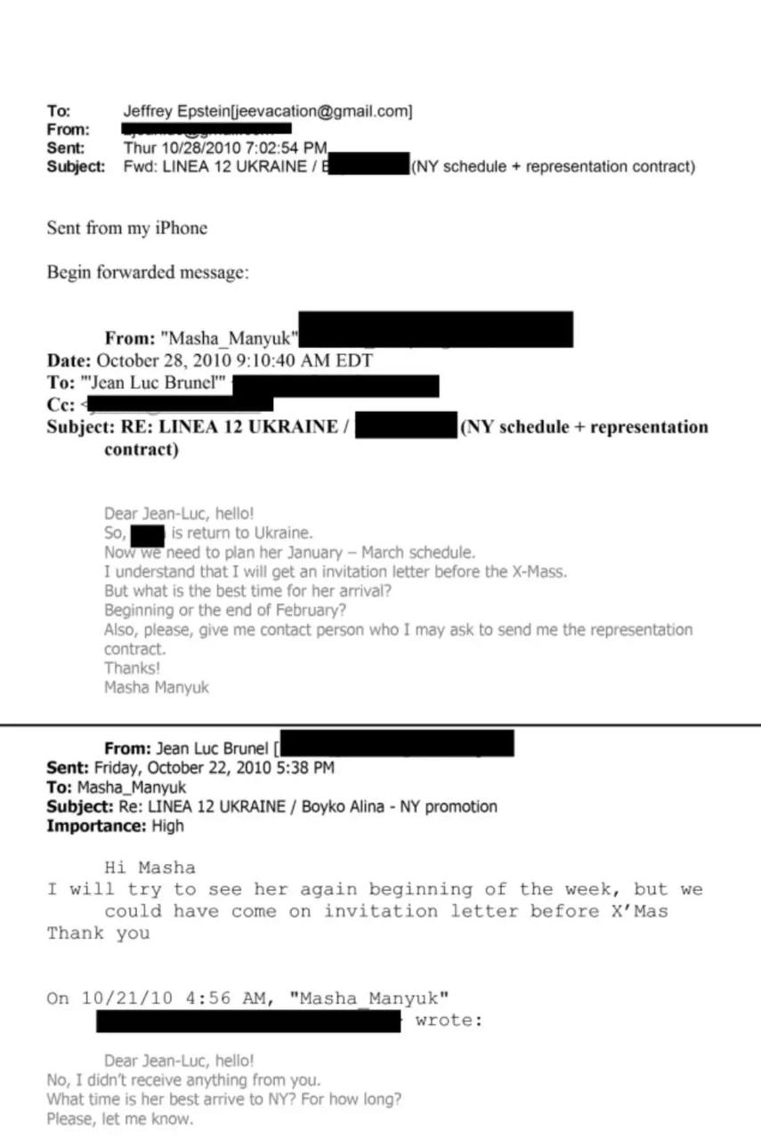 У файлах Манюк листується з модельним скаутом Жан-Люком Брюнелем, якого звинувачували у зґвалтуваннях та сексуальних домаганнях, і який наклав на себе руки у французькій в'язниці у 2022 році.