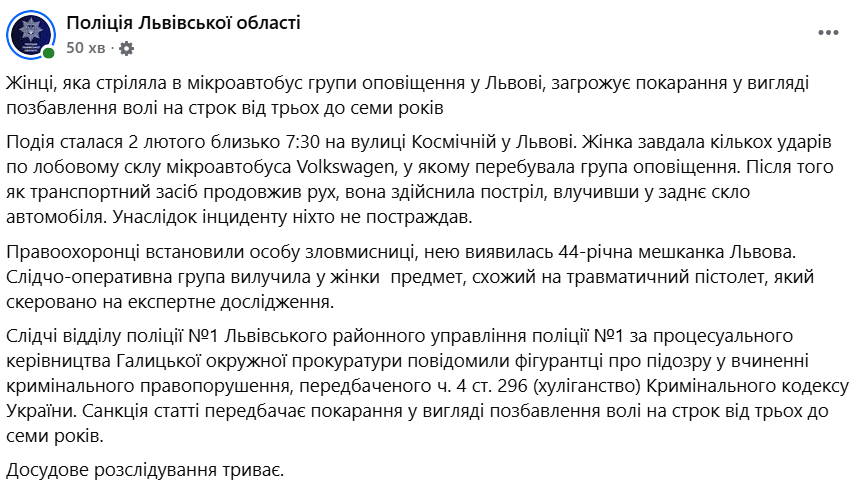 За інформацією відомства, у понеділок вранці 44-річна мешканка Львова побачила процес мобілізації, дістала травматичний пістолет і почала бити зброєю по склу мікроавтобуса, в якому перебували двоє співробітників поліції та працівники Галицько-Франківського ОРТЦК та СП, а коли машина рушила.