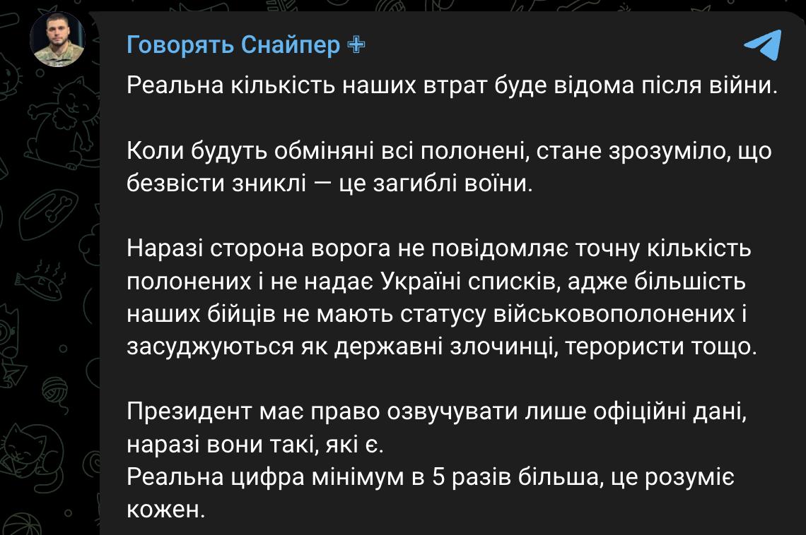 Військовий пише, що реальна цифра загиблих буде вищою через зниклих безвісти, яких президент у свою статистику не включив.
