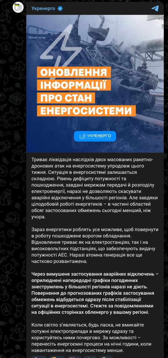 "Рівень дефіциту потужності та пошкодження, нанесені мережам передачі та розподілу електроенергії, наразі не дозволяють скасувати аварійні відключення у більшості регіонів", - додали в компанії.