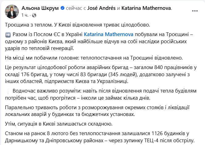 При цьому Шкрум закликала мешканців Троєщини ще потерпіти, оскільки бетонним спорудам потрібно кілька днів, щоб прогрітися після тривалого відключення, а в окремих будинках триває розморожування окремих стійок та ліквідація поривів безпосередньо всередині будинків та бюджетних установ.