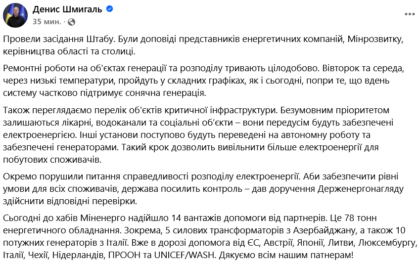 Шмигаль повідомив, що провів засідання штабу щодо ліквідації наслідків російських обстрілів енергетики. За його словами, ремонтні роботи на енергетичних об'єктах продовжуються цілодобово.