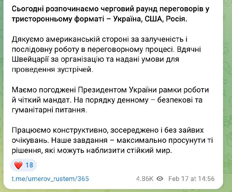 "У Женеві завершився перший день тристоронніх переговорів. Після спільної частини продовжили роботу в групах за напрямами. Обговорення були зосереджені на практичних питаннях і механіці можливих рішень. На сьогоднішній день і політичний, і військовий блоки завершили роботу. Дякуємо американським партнерам за конструктивну взаємодію і готовність працювати в робочому темпі. Завтра зранку політична та військова групи продовжать роботу", - написав він.