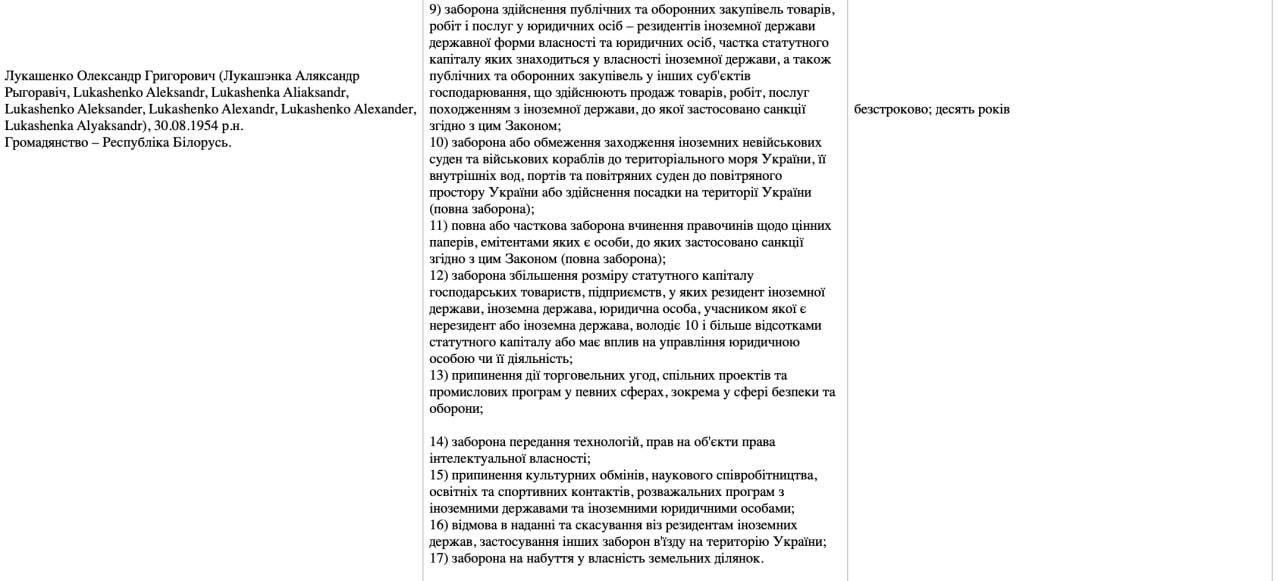 Санкції проти Лукашенка передбачають блокування активів, припинення торгівлі та транзиту, заборону фінансових операцій, участь у приватизації та оренді державної власності, держзакупівлі, оборонні закупівлі, операції з цінними паперами, передачу технологій, в'їзду в Україну, а також заходи суден до українських портів.