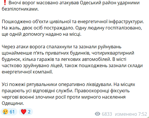 Як заявив голова міської військової адміністрації Сергій Лисак, роботи з ліквідації наслідків проводять у двох районах Одеси.