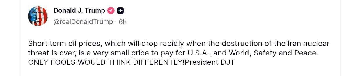 "Короткострокові ціни на нафту, які стрімко впадуть після завершення знищення іранської ядерної загрози, - це дуже мала ціна для США, миру, безпеки та миру. Тільки дурні можуть думати інакше!" - написав президент США у своїй соціальній мережі Truth Social.