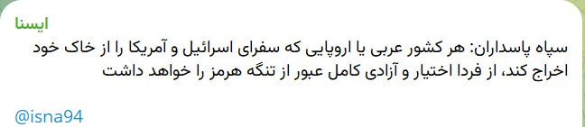 Тим часом Корпус вартових ісламської революції (КСІР) заявив, що дозволить прохід через Ормузьку протоку країнам, які видворять послів США та Ізраїлю.