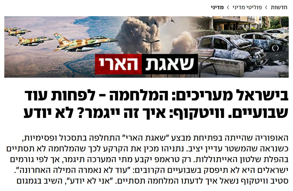 "Тільки Трамп визначить, коли закінчиться кампанія, але, за даними ізраїльських джерел, вона не закінчиться в найближчі два тижні: "Останнє слово ще не сказано". Стіва Уіткоффа запитали, як, на його думку, закінчиться війна. "Я не знаю", - сказав він. В Ізраїлі виходять із того, що тільки одна людина Трамп. Тому Ізраїль прагне максимально прискорити військові операції", – йдеться у публікації.