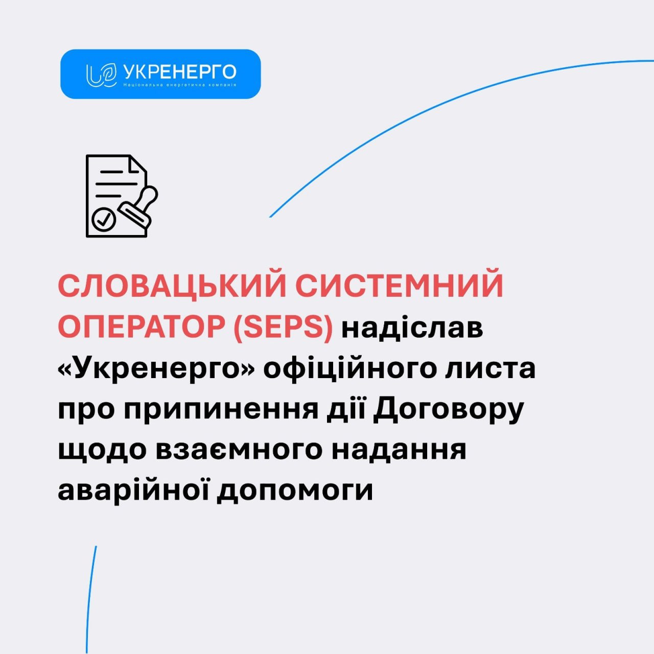 Україна отримала від Словаччини офіційний лист про припинення аварійного постачання електроенергії.