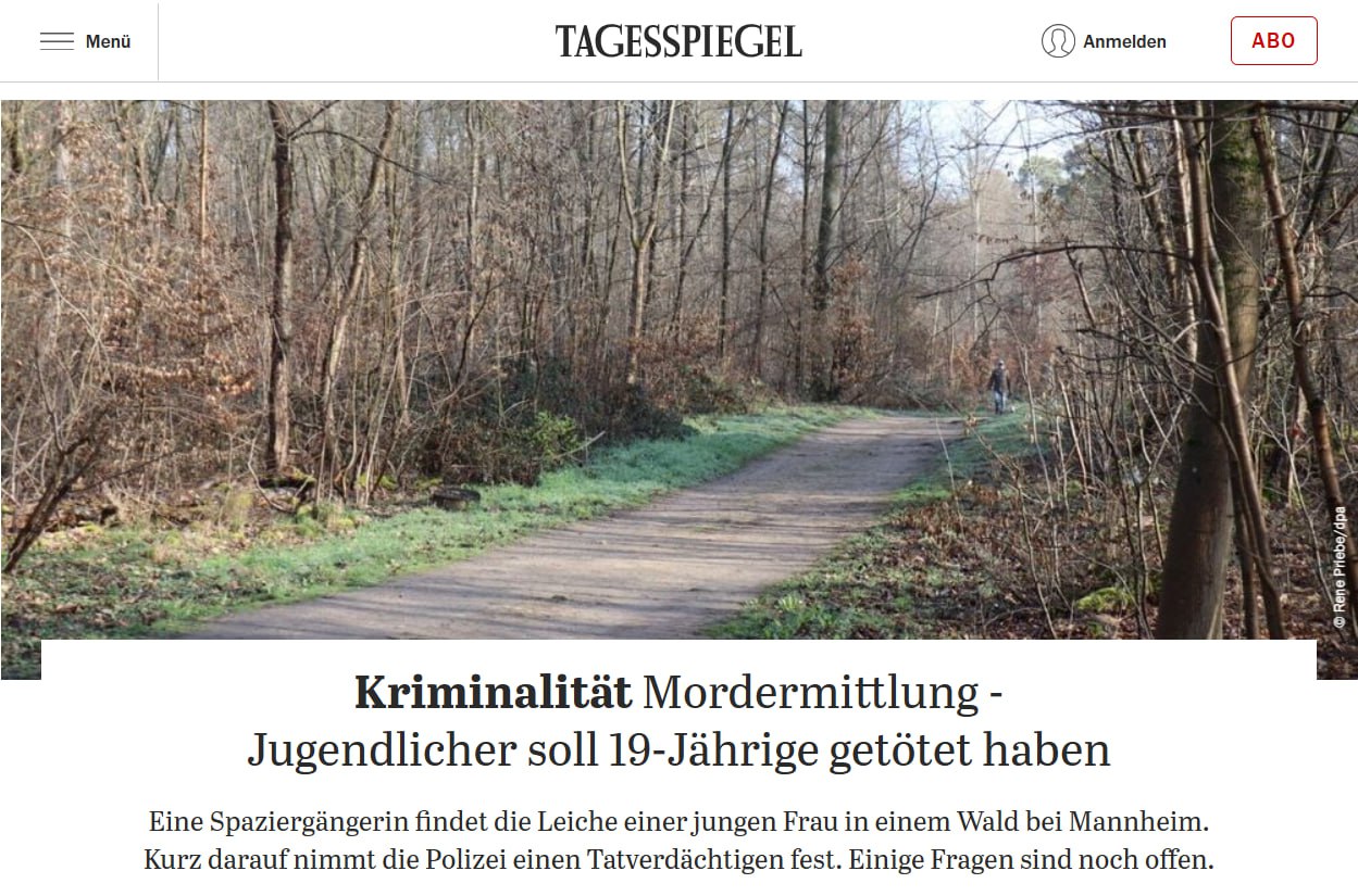 За даними слідства, йдеться про насильницьку смерть. Поліція швидко затримала підозрюваного – 17-річного сирійського мігранта, який мешкав неподалік. Слідчі припускають, що між ним та загиблою понад рік були стосунки, а трагедія могла статися після конфлікту.