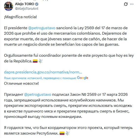 "Прекрасна новина! Президент Густаво Петро підписав закон 2569 від 17 березня 2026 року, який забороняє використання колумбійських найманців", – прокоментував парламентар рішення президента.