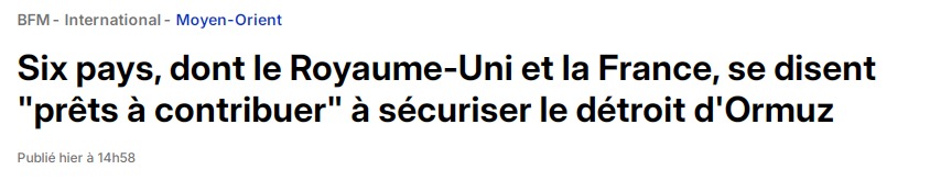 07:43 Франція, Великобританія, Німеччина, Італія, Нідерланди та Японія засудили іранські атаки на цивільну енергетичну інфраструктуру в Перській затоці і висловили готовність зробити свій внесок у безпеку Ормузької протоки, повідомив французький телеканал BFM.