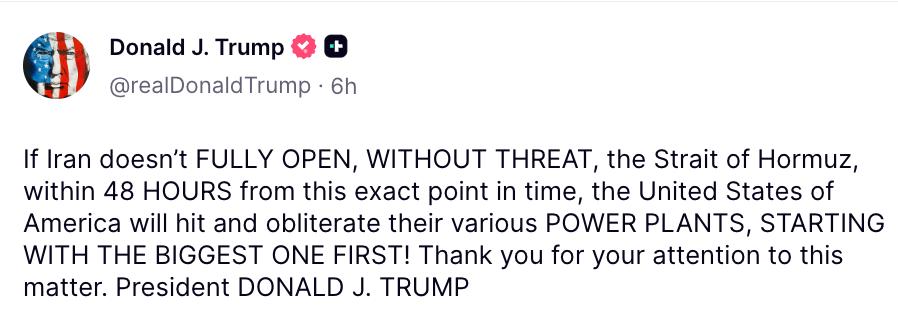 "Якщо Іран не відкриє повністю, без загрози, Ормузька протока протягом 48 годин з цього моменту, США завдадуть удару і знищать їх різні електростанції, починаючи з найбільшої. Дякуємо за увагу до цього питання", - йдеться у публікації.