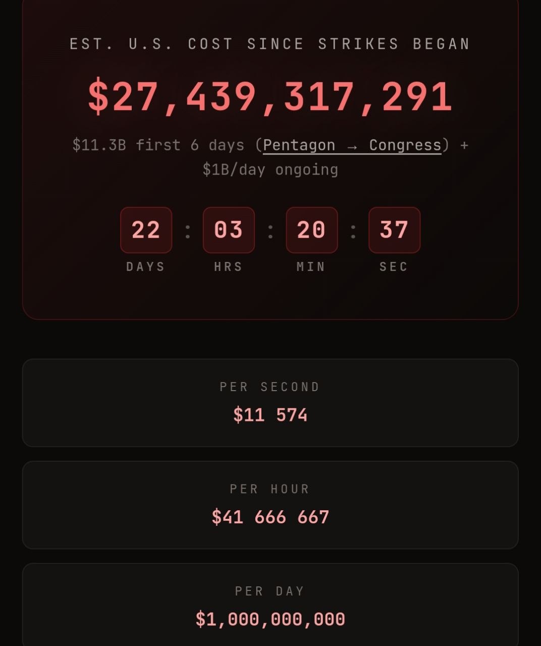 Таку оцінку дає моніторинговий ресурс Iran War Cost Tracker, який у режимі реального часу веде підрахунок за методикою, яка базується на доповіді Пентагону.