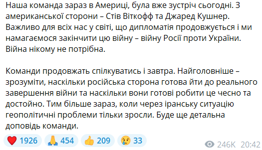 "Команди продовжать обговорення завтра (тобто, в неділю 22 березня - Ред.). Ключове питання полягає в тому, наскільки Росія готова рухатися до реального припинення війни, і чи готова вона зробити це чесно і гідно. Особливо зараз, коли геополітична напруженість тільки посилилася через ситуацію навколо Ірану. Більш детально".