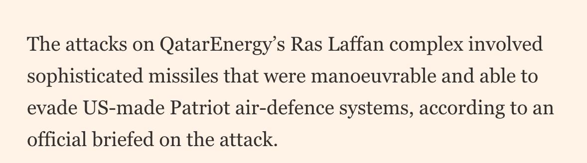 "За словами чиновника, поінформованого про атаку, при ударах по комплексу QatarEnergy у Рас-Лаффані використовувалися складні маневрені ракети, здатні обминати американські системи ППО Patriot", - йдеться у статті.