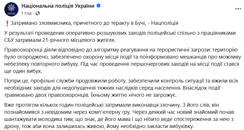 Поліція затримала 21-річного підозрюваного у причетності до ранкових вибухів у Бучі Київської області, внаслідок яких було поранено двох правоохоронців.
