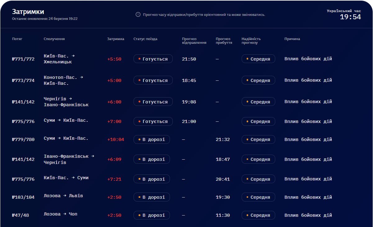 Тим часом "Укрзалізниця" повідомила, що дев'ять потягів спізнюються на час від 3 до 6 години через "вплив бойових дій".