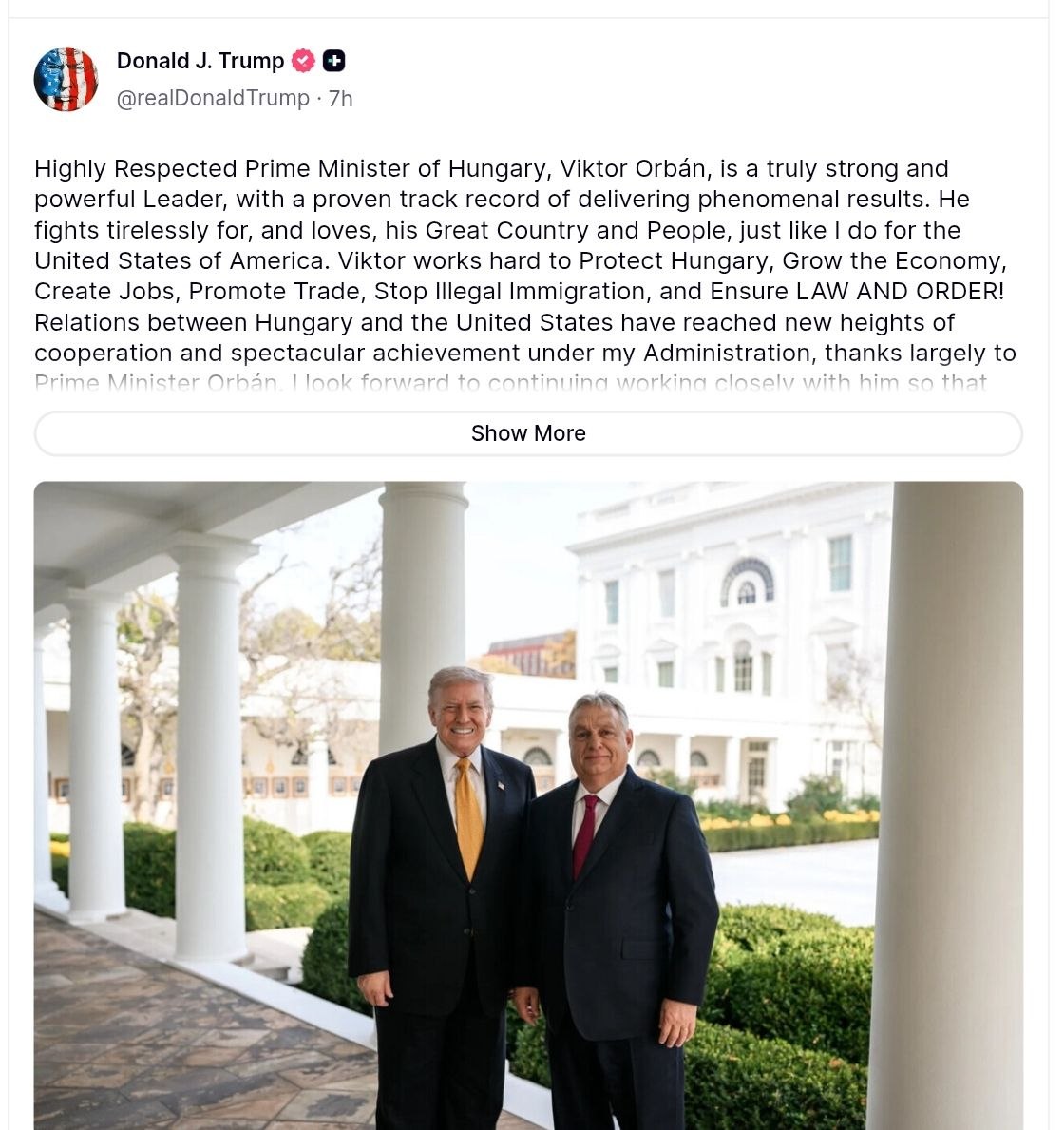 Трамп також заявив, що "гордий знову підтримати Орбана на переобрання" і закликав виборців: "Угорщина, виходьте та голосуйте за Віктора Орбана". Він додав, що перебуває "з ним до кінця" і назвав його "справжнім другом, бійцем та переможцем".