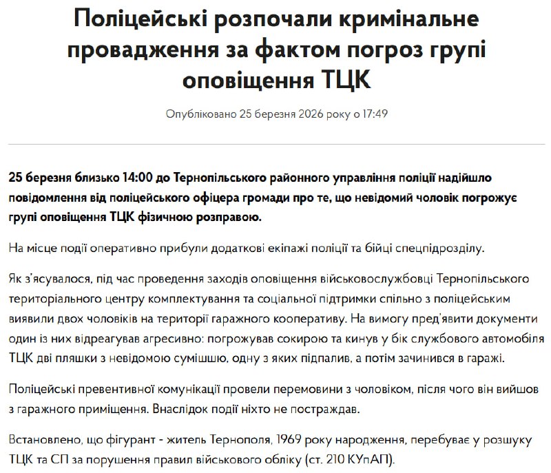 На вимогу пред'явити документи один із них відреагував агресивно: погрожував сокирою та кинув у бік службового автомобіля ТЦК дві пляшки з невідомою сумішшю, одну з яких підпалив, а потім закрився у гаражі. Звідти він вийшов після переговорів із поліцією.