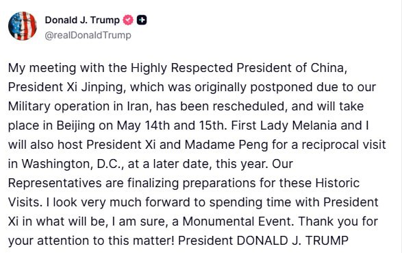 "Моя зустріч з шановним Сі Цзіньпіном, яка спочатку була відкладена через нашу воєнну операцію в Ірані, перенесена і відбудеться в Пекіні 14 і 15 травня. Перша леді Меланія і я також приймемо голову Сі і мадам Пен з візитом у відповідь до Вашингтона пізніше", - сказав він. написав президент США у своїй соціальній мережі Truth Social.