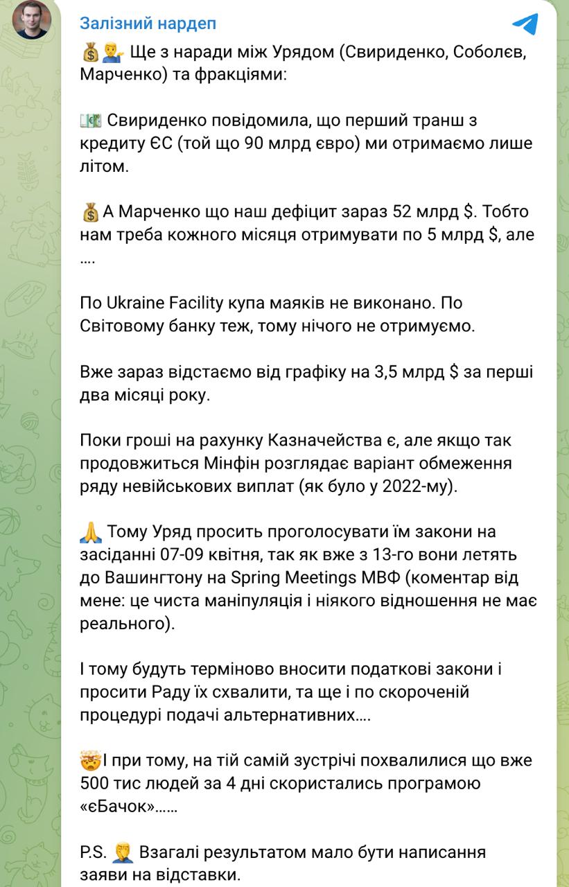 "Тобто нам потрібно отримувати по 5 млрд доларів щомісяця, але... За Ukraine Facility купа маяків не виконана. По Світовому банку теж, тому ми нічого не отримуємо. Вже зараз ми відстаємо від графіка на 3,5 млрд доларів за перші два місяці року. Поки гроші на рахунках казначейства ще є, але якщо так піде далі, Мінфін2 розглядає варіант. року)", - написав Желєзняк.