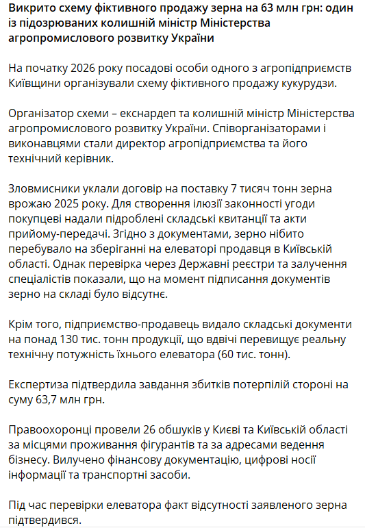 "На початку 2026 року посадові особи одного з агропідприємств Київської області організували схему фіктивного продажу кукурудзи. Організатор схеми – екс-нардеп та колишній міністр Міністерства агропромислового розвитку України. Співорганізаторами та виконавцями стали директор агропідприємства та його технічний керівник", - заявили у відомстві.