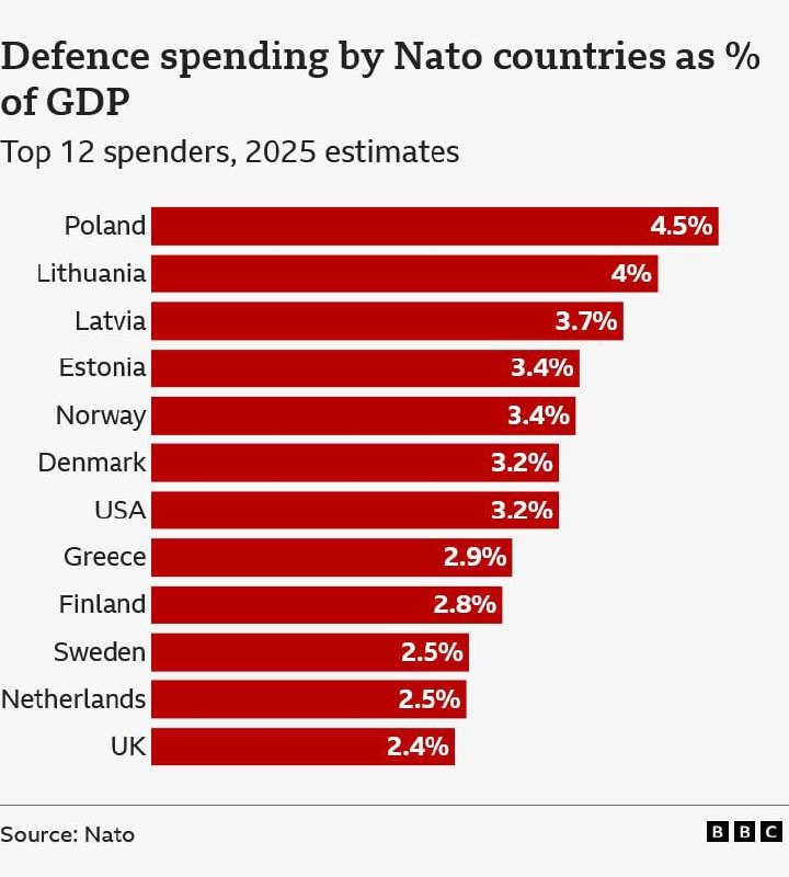Західні ЗМІ пишуть, що всі країни північноатлантичного альянсу НАТО вперше досягли мети 2% ВВП на оборону в 2025 році.