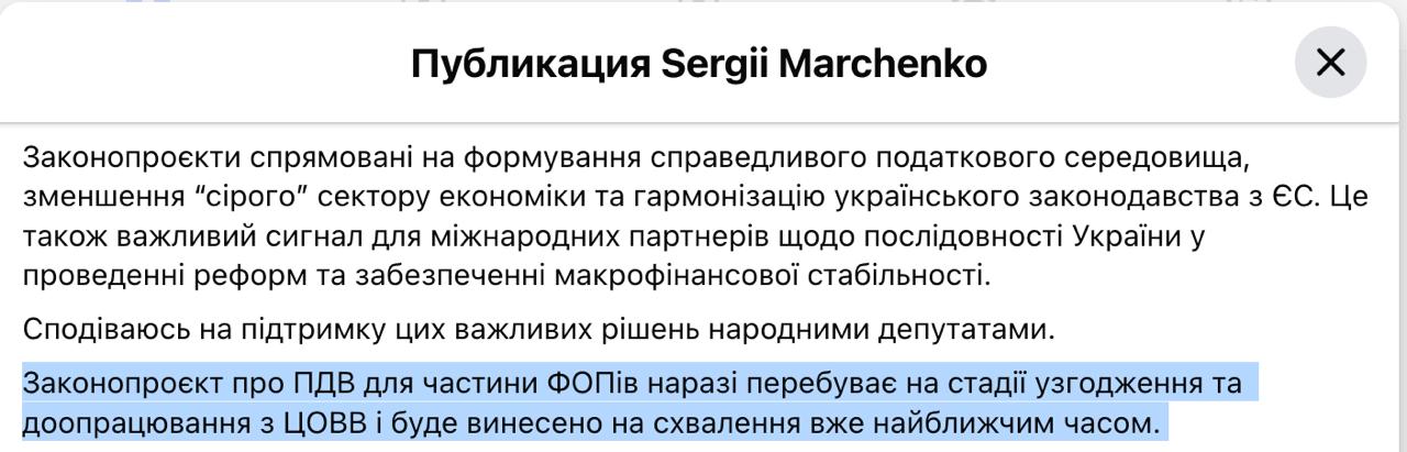 "Законопроект про ПДВ для частини індивідуальних підприємців наразі перебуває на стадії узгодження та доопрацювання з центральними органами державної влади та буде винесений на затвердження найближчим часом", - написав глава Мінфіну у Фейсбуці.