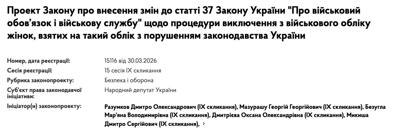 За словами нардепів, необхідність першого проекту обумовлена тим, що наразі не існує механізму зняти з військового обліку та прибрати з розшуку помилково взятих на нього жінок.