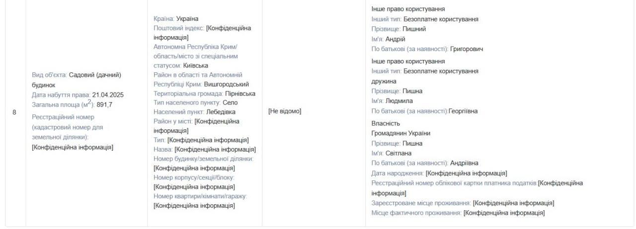 У декларації за 2025 рік Андрій Пишний зазначив, що він із дружиною Людмилою має право безкоштовного користування особняком на 891,7 кв. м, а його власником є їхня донька Світлана Пишна. Також вони можуть користуватися її землею (дві ділянки), на яких вона розташована.