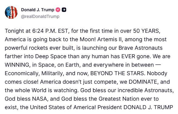 "Сьогодні о 18:24 за східним часом США (01:24 за Києвом, – Ред.) вперше за більш ніж 50 років повертаються на Місяць! Артеміда II, одна з найпотужніших ракет, що коли-небудь побудованих, відправляє наших сміливих астронавтів далі в глибокий космос усі втечі на Землі в Землі в Землі в Землі в Землі в Землі в Землі в Землі в Землі втікає в Землі в бік Землі в Землі в Землі в Землі в Землі в бік. ними: економічно, військово і тепер – за межами зірок. Ніхто поряд не стоїть!