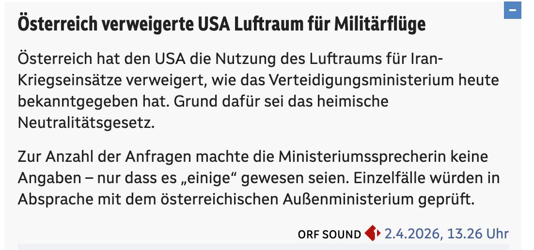Офіційний представник Міноборони Австрії полковник Міхаель Бауер розповів, що з початку конфлікту на Близькому Сході країна відхилила всі запити США пролітати військові літаки над своєю територією.