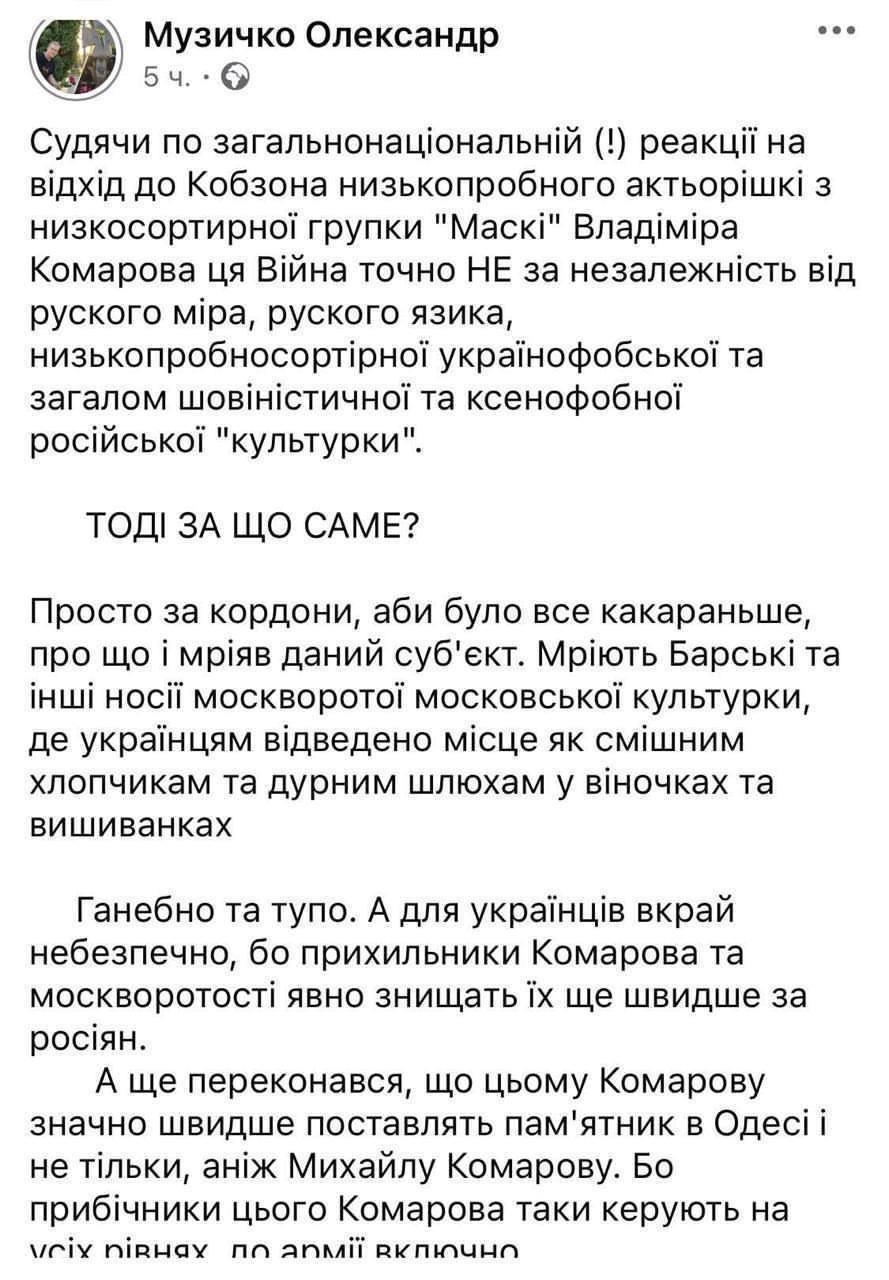 "На російських ресурсах сьогодні суцільне співчуття і жалоба по одеському українофобу, ліцедею, паяцю, кривляку Володимиру Комарову. Судячи з загальнонаціональної (!) реакції на від'їзд до Кобзону низькопробного акторка з низькосортної групки "Маски" Володимира Комарова, ця війна точно не українофобської та в цілому шовіністичної та ксенофобної російської "культурки". Тоді за що ж? Музичко у Фейсбуці.