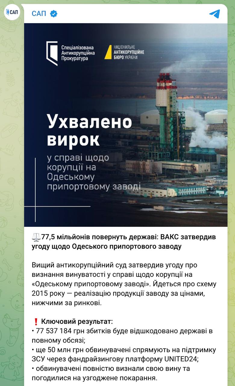 За угодою учасники схеми компенсують 77,5 млн. гривень, ще 50 млн. гривень вони спрямують на підтримку ЗСУ.