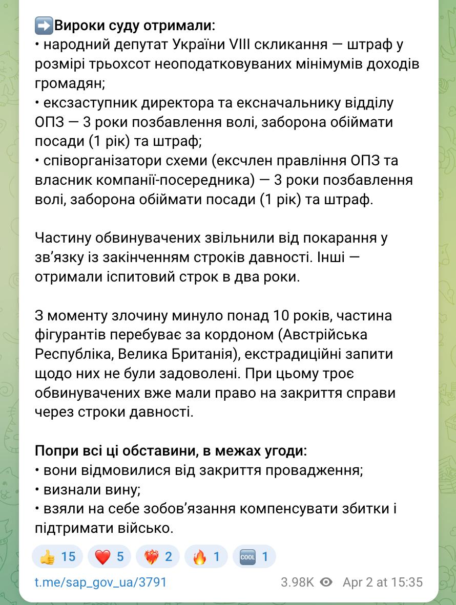 Заявляється, що решта фігурантів справи також визнали свою провину і пішли на угоду зі слідством, отримавши умовні терміни.