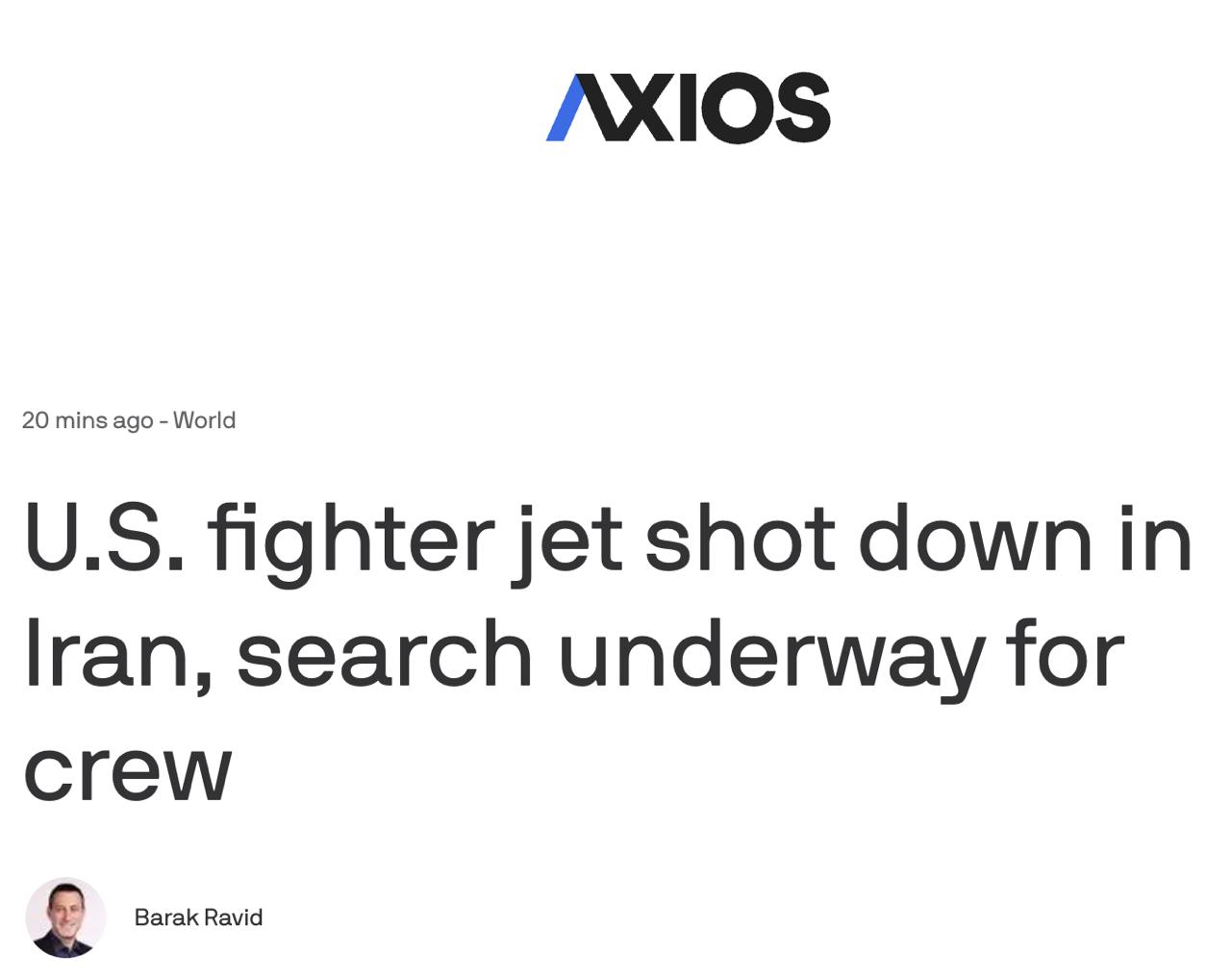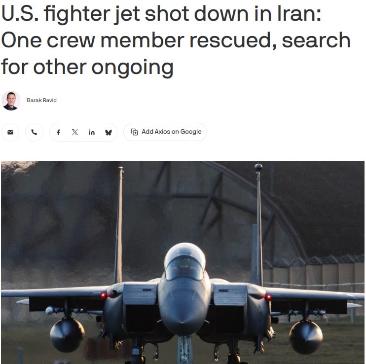 Джерела Axios також відзначають, що одного з двох членів екіпажу американського винищувача, збитого над Іраном, було виявлено і врятовано американськими спецназівцями, а пошуки другого продовжуються.