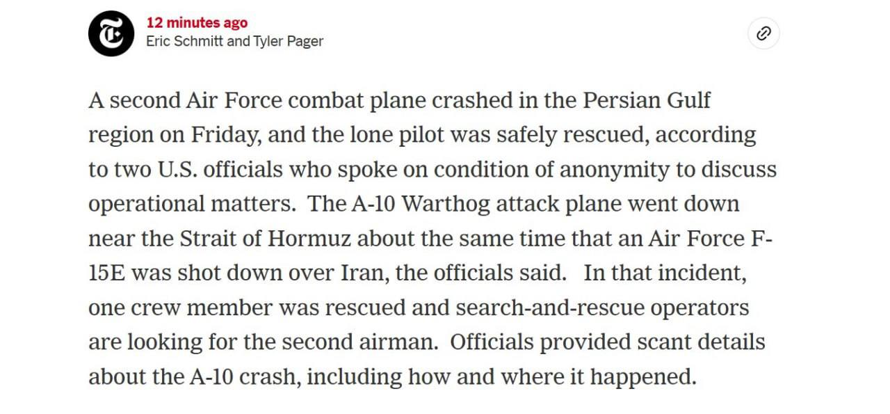 Телеканал Newsmax з посиланням на американського чиновника також повідомив, що іранські сили на додачу вразили гелікоптер Black Hawk, який брав участь у пошуково-рятувальній операції з евакуації екіпажу зниклого F-15E на південному заході Ірану. Раніше його помилково ідентифікували як F-35.