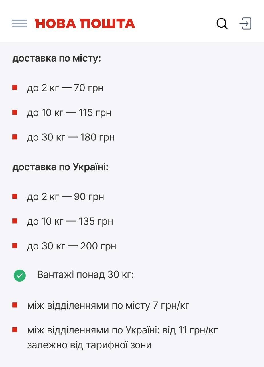 Для вантажів понад 30 кг тариф по місту між відділеннями становитиме 7 грн за кілограм, а по Україні між відділеннями – від 11 грн за кілограм залежно від тарифної зони.