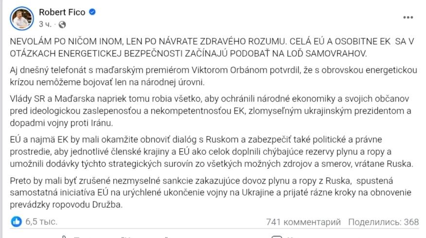 Словацький прем'єр заявив про необхідність скасування обмежень на імпорт газу та нафти з РФ, виступивши за відновлення діалогу з Москвою. З його слів, поточна політика ЄС у сфері енергетики веде до саморуйнування.